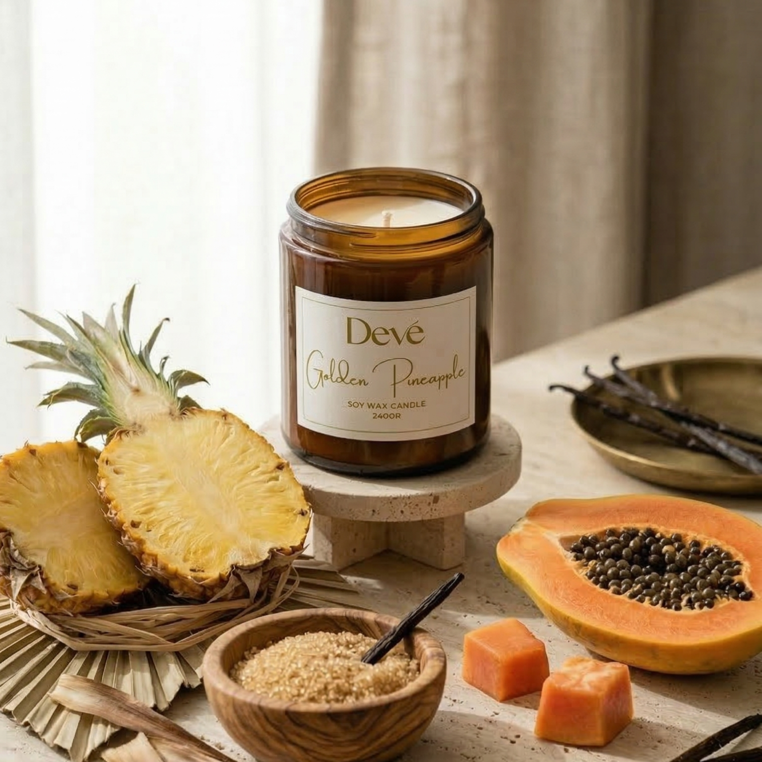 Ένα λαμπερό, τροπικό άρωμα που γεμίζει τον χώρο με ζωντάνια και καλοκαιρινή διάθεση. Ζουμερός ανανάς και εξωτικά φρούτα συνδυάζονται με γλυκές, δροσερές νότες μανταρινιού, ενώ η απαλή βανίλια και η ζάχαρη στη βάση δημιουργούν μια απολαυστικά φρουτώδη και γλυκιά ατμόσφαιρα.